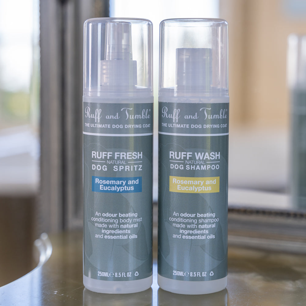 • Choose a gentle and natural dog shampoo and spritz, like Ruff and Tumble’s Ruff Wash and Spritz. The essential oils of Rosemary and Eucalyptus are especially designed to help neutralise doggy odours. The Spritz helps to detangle fur after washing, which means less of a struggle with a wet dog in the bathroom! Massage the shampoo into the dog’s body, as they’ll love the contact. We all love a good head massage when we are at the hairdresser, and it’s no different when your dog is having a dog bath!