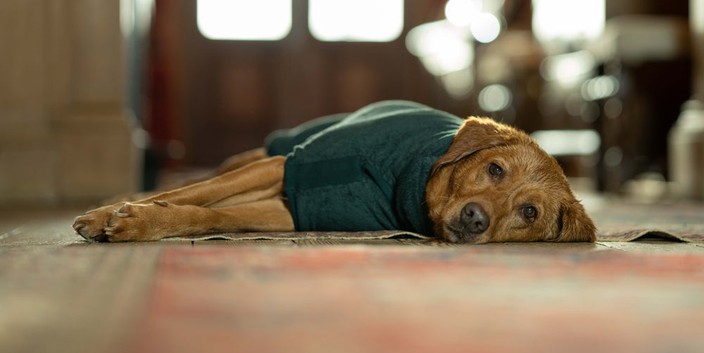 Drying dogs thoroughly and quickly in winter is vital because it’s cold. The quickest and warmest way to dry a dog is with a Ruff and Tumble Drying Coat. Made of two layers of cotton towelling, the coat wicks wet from fur as it warms and dries the dog. Easy to pop on, the dog can walk, eat and sleep inside the house as it dries completely and easily. Drying Coats are practical for washing dogs at home because they instantly contain shake off and help to reduce the mess indoors. The natural cotton breathes as it dries, which means the dog can wear the coat until they are totally dry.