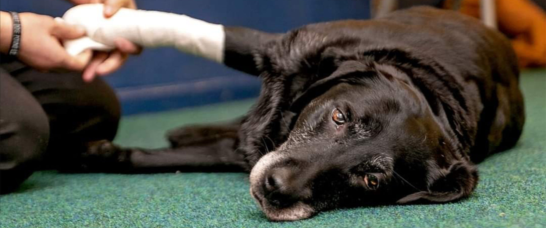 If a dog is injured and cannot walk it may try to bite you as you are handling him. It may be useful to use an emergency muzzle. You can use a bandage from your First Aid Kit, a leg from a pair of tights is a good item to put in your kit as they make great muzzles.