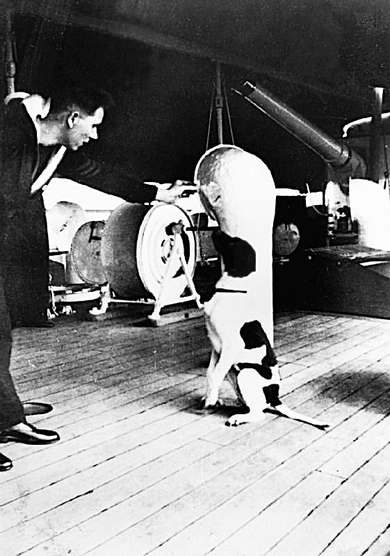 1945. Despite being torpedoed, imprisoned, and shot at, she had three litters of puppies! Her stalwart support of the men – who protected and smuggled her with them everywhere – was phenomenal. Not only did she hear the enemy before