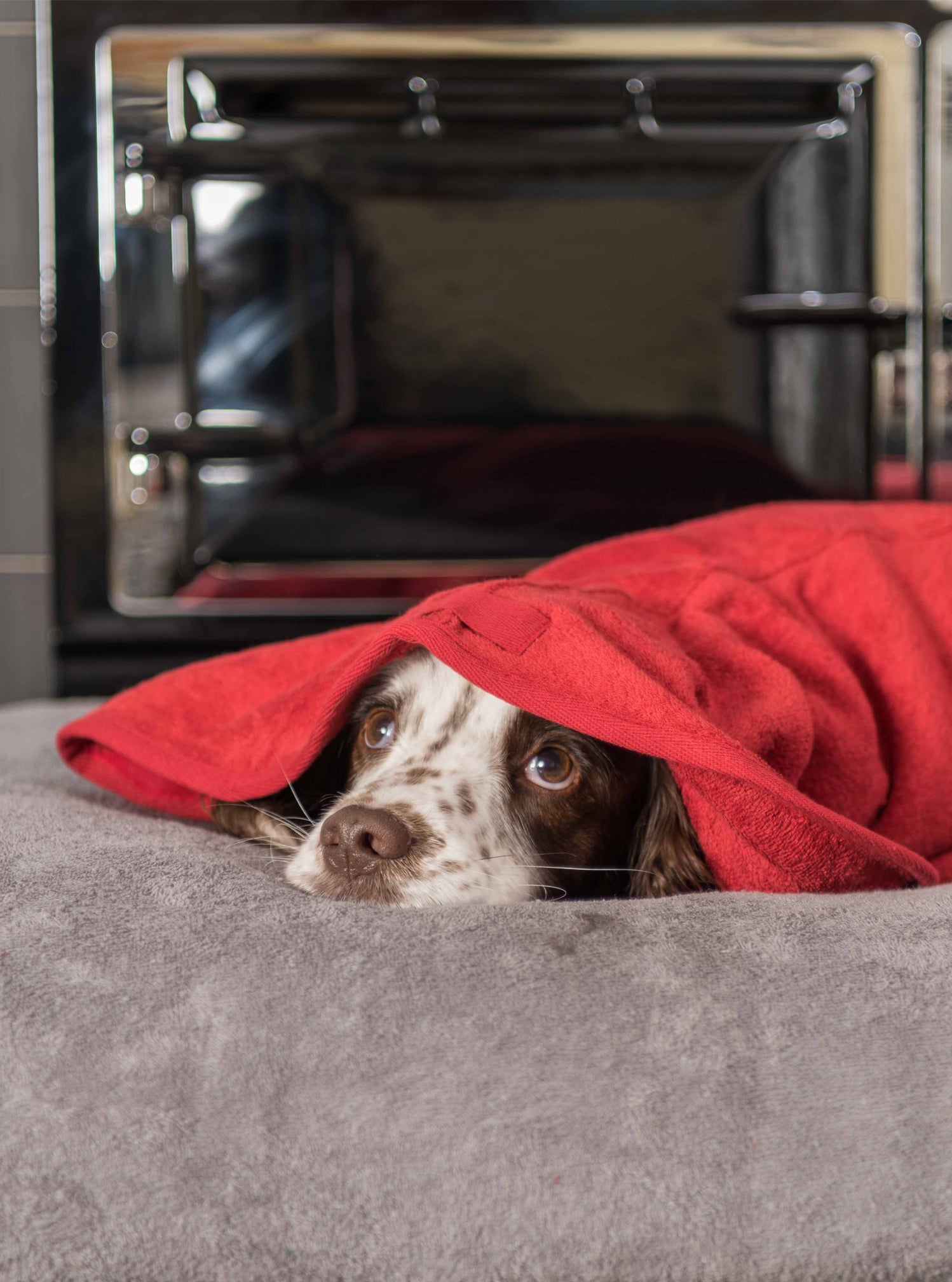 Your dog will read you and note your nerves. If you are a bit over fussy, they'll notice and wonder why. If you are your normal self, and keep calm, they'll be calmer. It might be hard to not react more to their distress but it's kinder and it will help them more. Wrap them in their Ruff and Tumble dog Drying Coat before the fireworks begin. Your walk will be earlier than normal anyway, so after that, pop on the Drying Coat and keep it on. Put the hood up and fasten over the ears as this will help to deaden the noise too. The coats work like swaddling babies and make them feel safe, secure and comfortable. We know that some customers can find the effect instant and very helpful. Consider making a special area where they can feel safe, like their crate or a comfy bed under a table with a blanket over it. If their favourite place is near you, even better. It sounds obvious but stay close to them and be there constantly to reassure them, because your presence will be a huge factor in calming them.