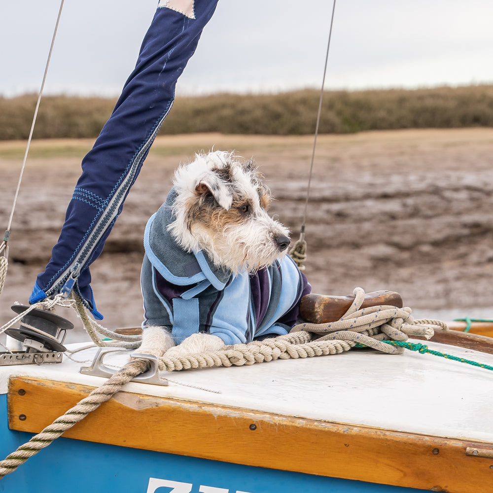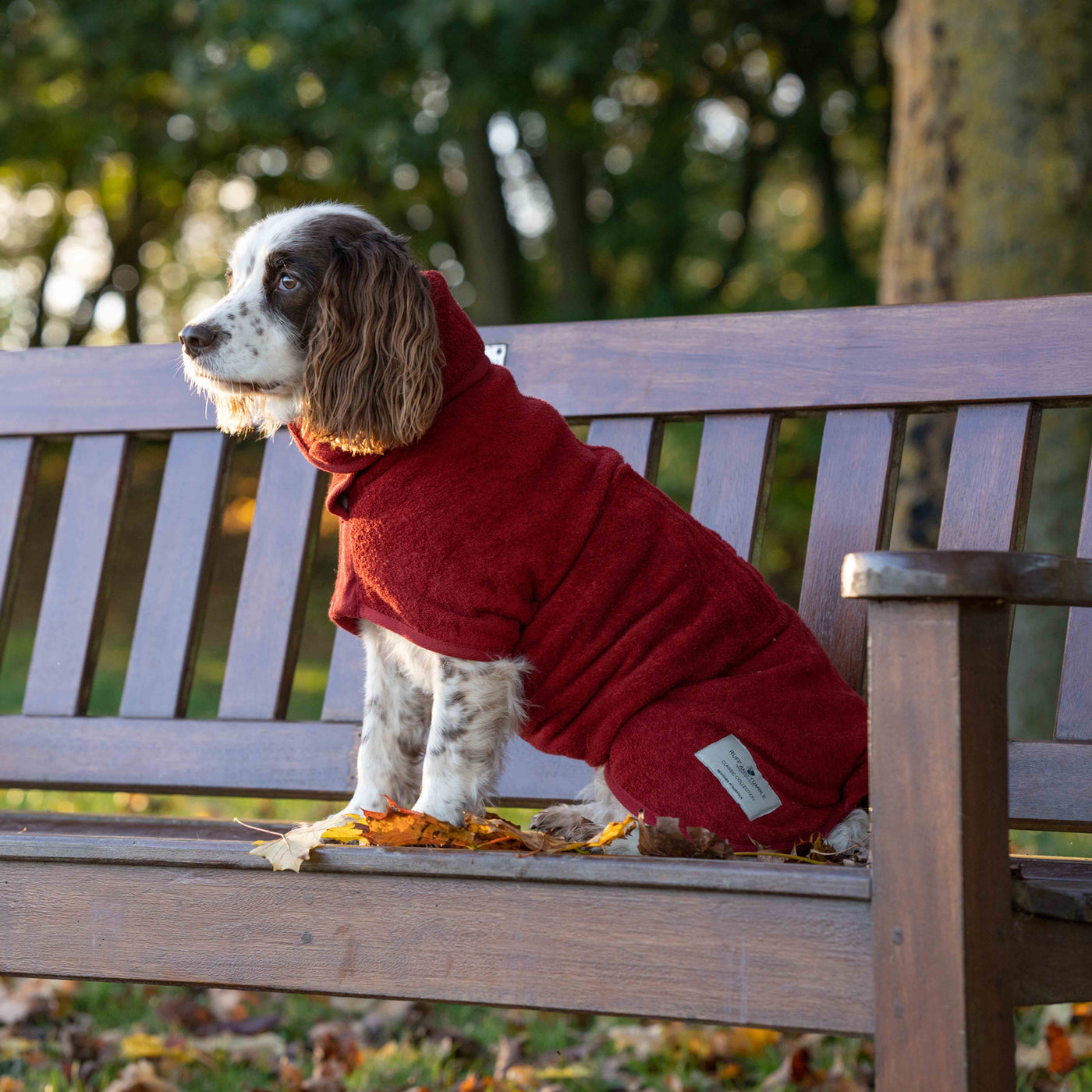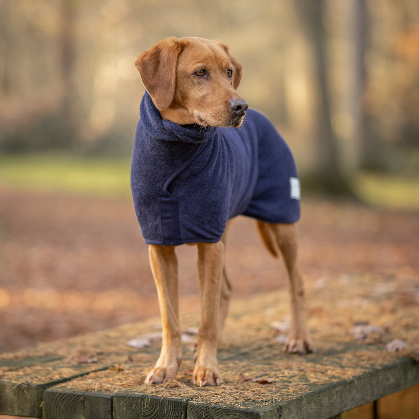 A crucial feature of our Drying Coats is that we use two layers of towelling. This is key because the under-layer wicks away the moisture from the dog’s fur. Their body heat then pushes the moisture through to the outer layer of the coat, thus ensuring that the dog does not sit in a damp towel. The dog dries first, followed by the coat which dries itself from the inside out whilst being worn. This makes the Ruff And Tumble Drying Coat more effective at drying than single layered coats.