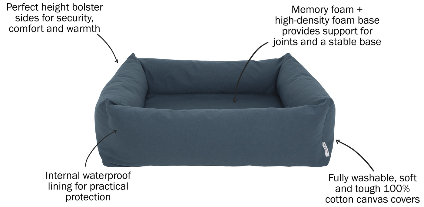It's not just your dog who will love our new Burnham Bolster Bed - you will too. Dog beds have to work for dogs and humans equally. It's galling when a bed promises comfort but your dog ignores it, or if the dog's favourite is not yours! The perfect bed is one which is comfortable, long-lasting and stylish. Unique to the Ruff and Tumble Burnham Bolster Bed is the durable canvas cover. Tough, machine washable, modern and fresh, it's more present-day than yesterday. The waterproof base liner, mattress cover and inner bolster pillows ensure that accidents do not penetrate the bed structure and weaken or spoil it. The canvas bed cover is fully washable, but add a new matching thick towelling Bolster Bed Cover, and you'll protect your bed and find washing even easier.