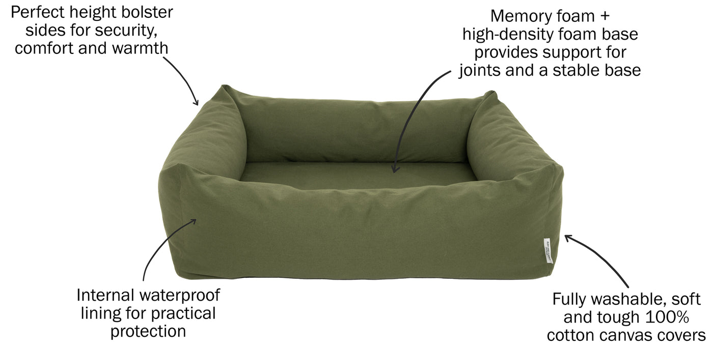 Our Burnham Bolster Dog Beds are hand made in the UK to order. Please allow 2-4 working days to despatch.