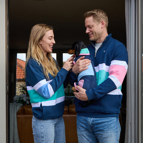 The Evesham Quarter Zip jumper from Whale of A Time is a must-have layer for easygoing style and comfort. Featuring the timeless Whale Of A Time signature colour block design, this classic piece will never go out of fashion.