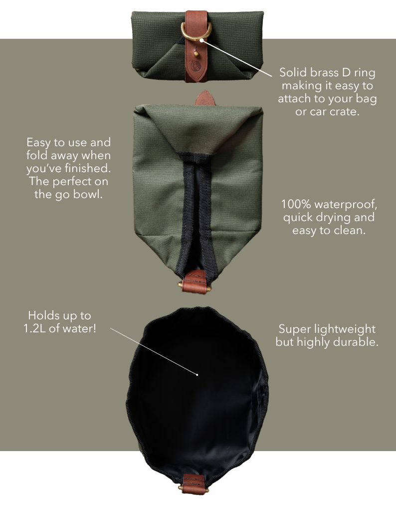 This waterproof dog bowl is fast drying and simple to clean, it features a solid brass D ring making it easy to attach to your bag or car crate. Once used, fold the bowl and fasten with the natural leather strap embossed with the Ruff and Tumble logo, adding a touch of sophistication.