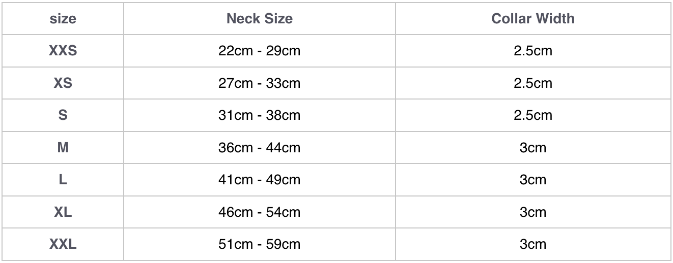 Available in seven sizes (XXS to XXL), our collars are tailored to fit a wide range of breeds.